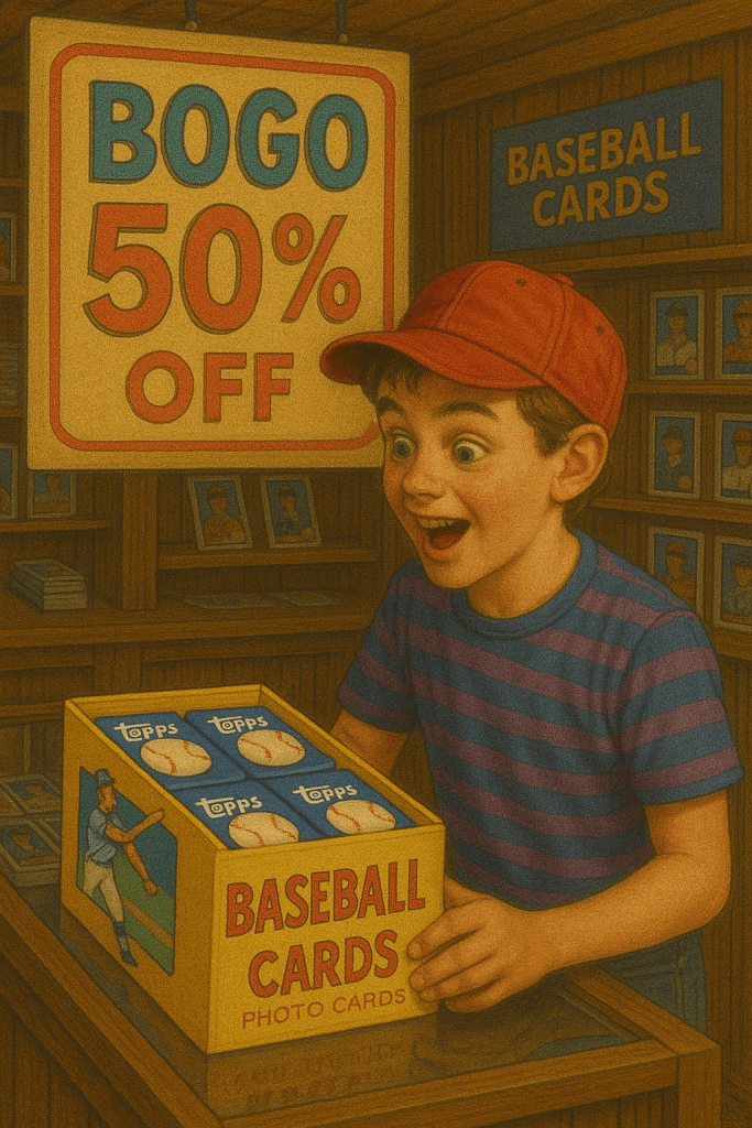 The boy walked into the baseball card shop and was thrilled to see that they were having a BOGO 50% off sale.